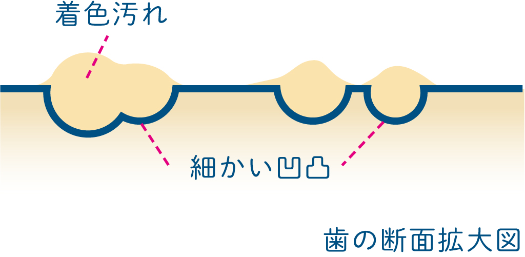 歯の表面は拡大すると凹凸があり、着色汚れなどが入り込み歯を染めています。
