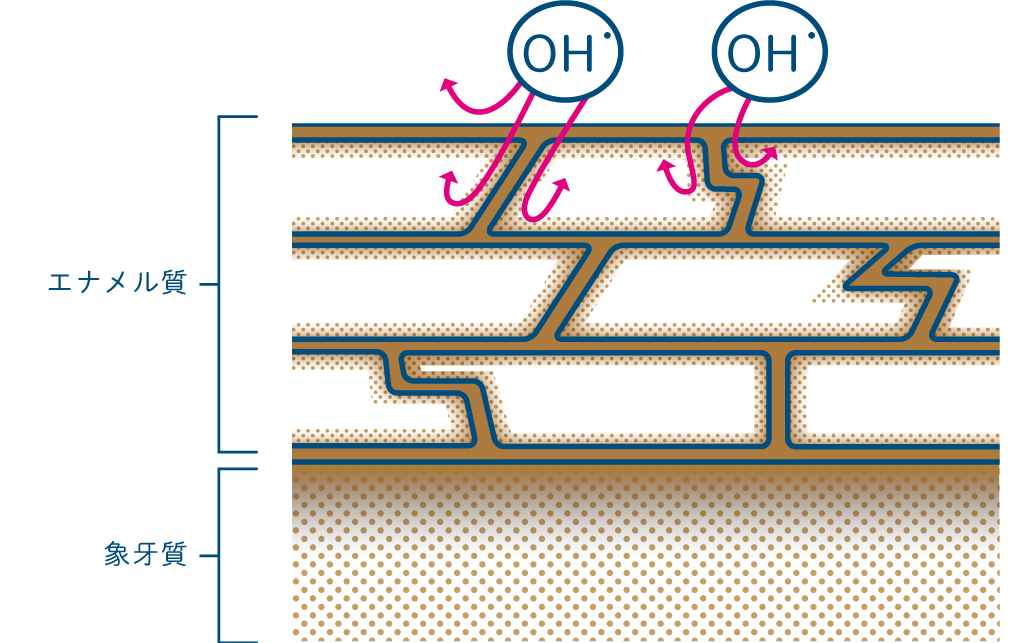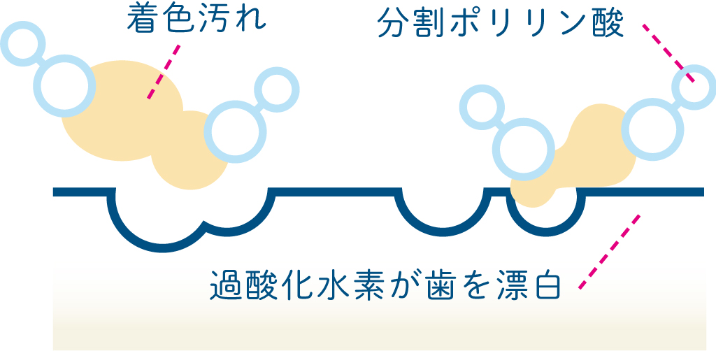 高濃度過酸化水素が歯自体の色を漂白します。分割ポリリン酸の作用により、汚れを剥がしていきます。