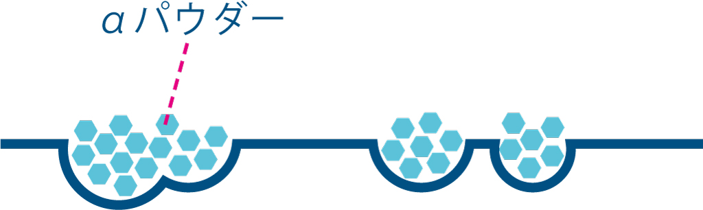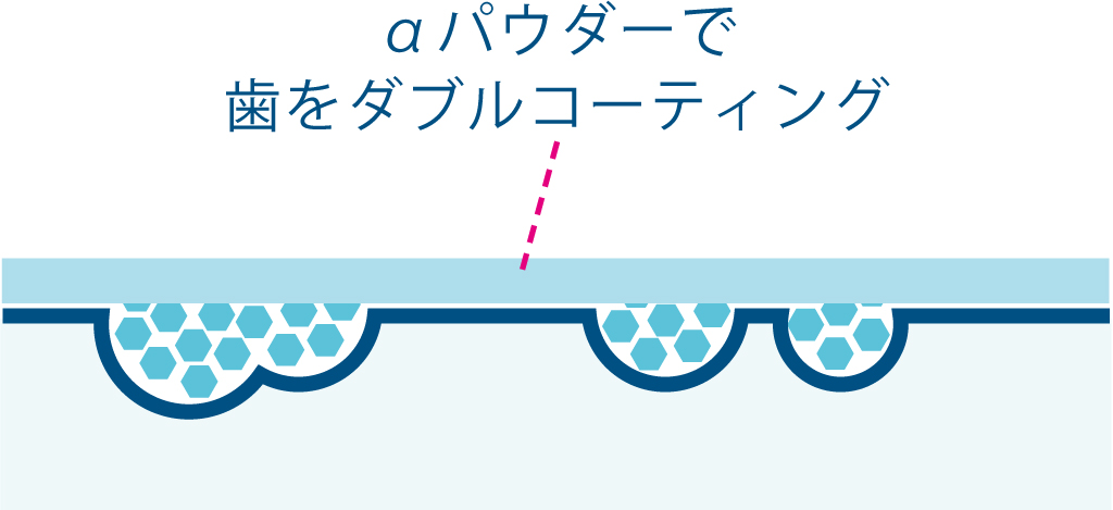 歯と同じ成分(αパウダー)を塗布することにより、歯の凹凸は埋まっていきます。その上からフッ素(F)を作用させることにより石灰化が促進され、表面をCAPします。虫歯になりにくい歯へと導きます。
