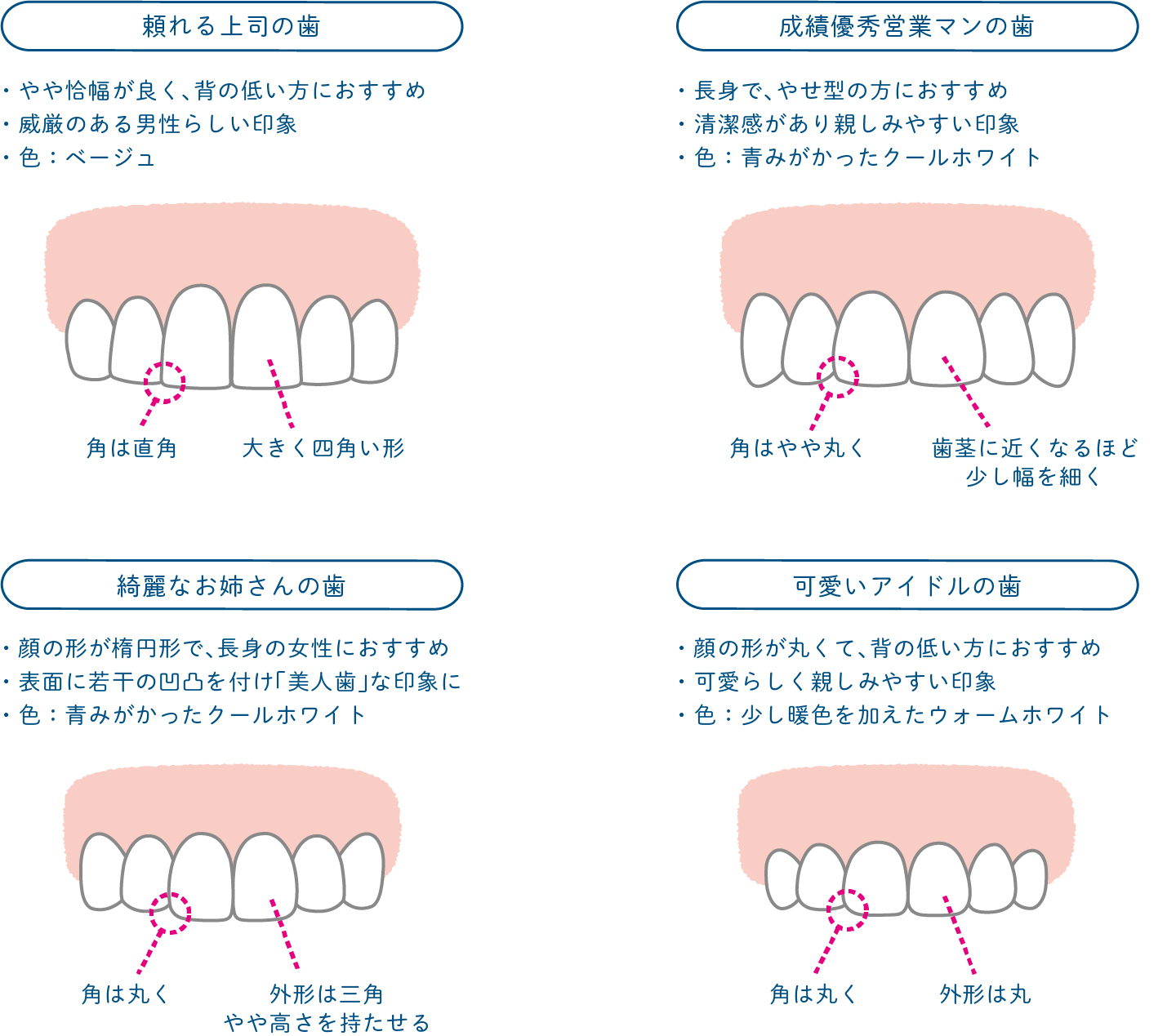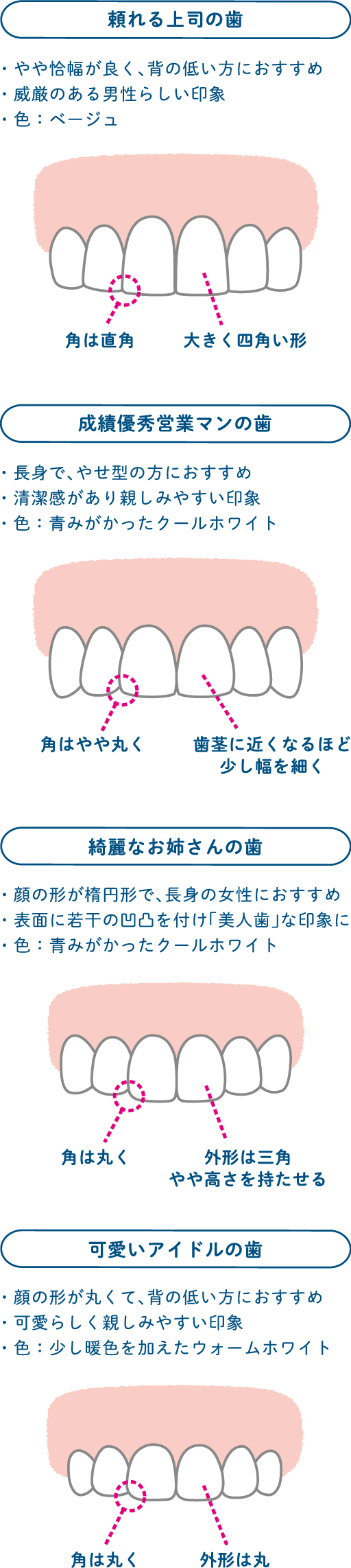 自分のビジネスや、立場、性格に歯の色・形を合わせることで、ある程度お顔の印象を変えることができます。当院では、図のようなバリエーションの中から、あなたにぴったりの歯を選びます。