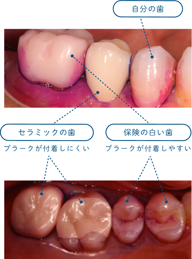 「レジン」と「セラミック」、見た目はどちらもきれいですが、プラークの付きやすさや舌触りは大きく異なります。プラークチェックをすると、写真のようにプラークが付着するのは自分の歯と「レジン」部分のみで、「セラミック」部分には一切付着していないことがよくわかります。ケアに自信がない方は、「セラミック」で全て治療することをおすすめします。