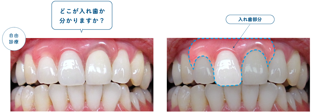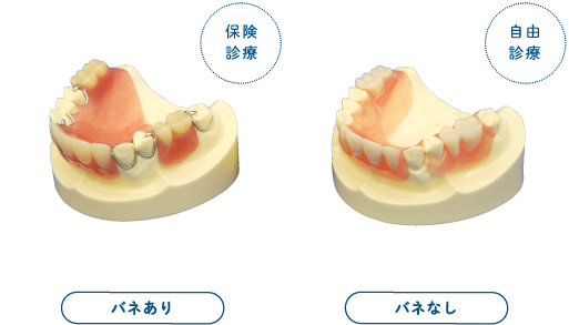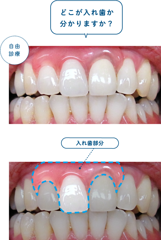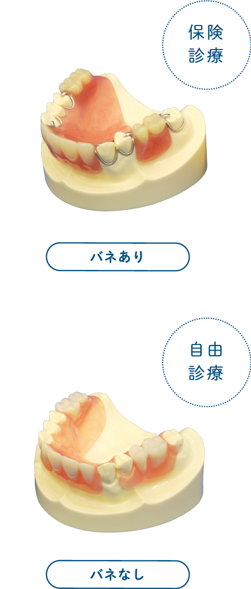 最も古い治療方法。大きな偽歯が入るので異物感が大きく見た目も悪いですが、生体には非常に優しいです。隣の歯を削る必要もなく、入れ歯を外せば歯磨きもしやすいです。支えのためのバネが目立ち審美性が悪いように思われますが、自由診療ではバネがなくきれいな入れ歯もありますので、まずはお問い合わせください。